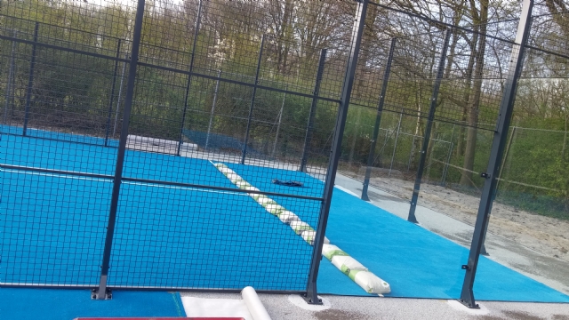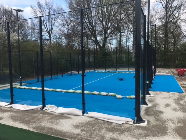 Laatste fase van de aanleg is het leggen van het kunstgras. Ook dit is een precies werkje maar de blauwe ondergrond zal straks met plezier de eerste spelers verwelkomen. Nog eventjes doorzetten en op naar 14 April voor de officiele opening!!!